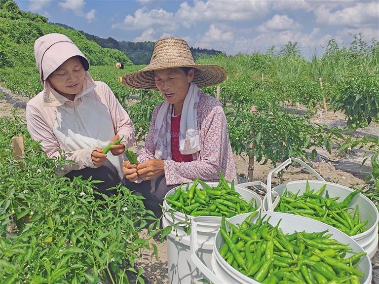 8月22日,保靖縣碗米坡鎮白云山村的辣椒基地里,基地負責人吳阿芬(左)正在與采摘人員交流。今年來,白云山村開荒種植了約200畝樟樹港辣椒,帶動近百人長期就業。因當地海拔高、生態好,種出的辣椒香甜可口,在高端市場大受追捧,供不應求。 團結報全媒體記者 朱開朗 攝