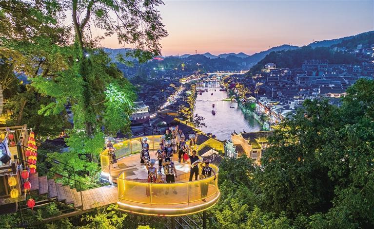 8月21日,鳳凰古城南華山風景區的鳳凰之心觀景臺上,游客身著苗族盛裝拍照打卡。從此處,游客可眺碼頭跳巖、觀沙灣煙火、賞沱江蜿蜒,盡攬一城美景。 團結報全媒體記者 張謹 攝