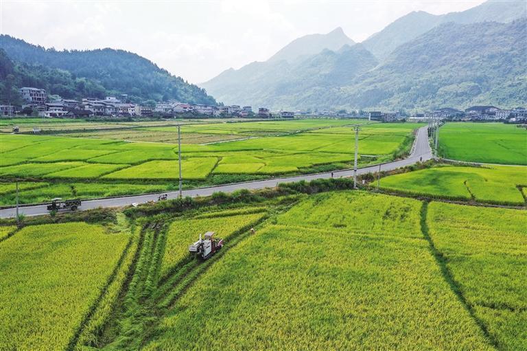 9月3日,龍山縣苗兒灘鎮黎明村,水稻成熟,田間收割機不斷穿梭,一幅豐收好圖景。曾祥輝 攝