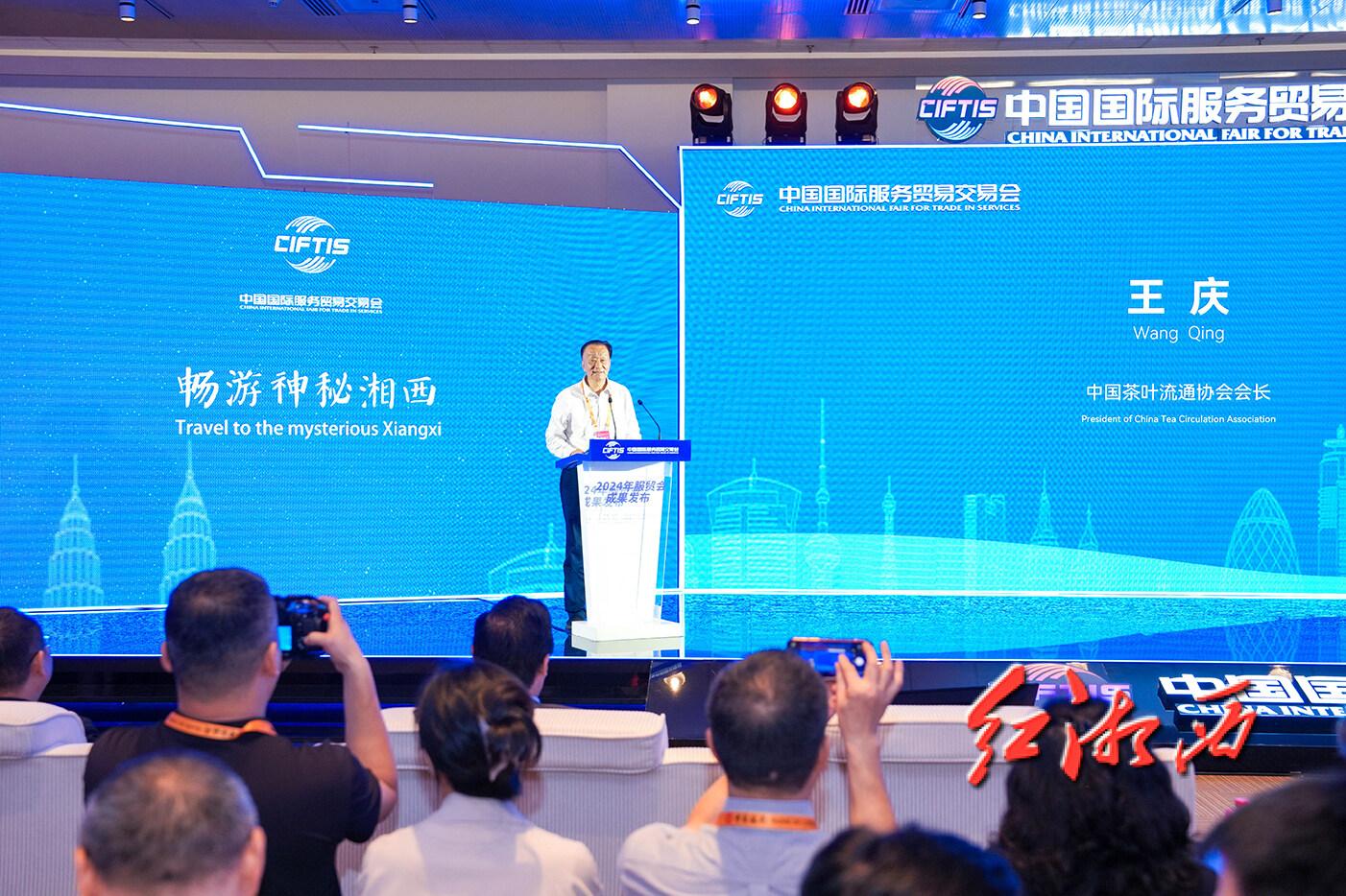 9月14日,世界地理標志品牌分銷服務大會在北京舉行,湘西州委常委、州委秘書長向邦偉攜湘西茶企參加大會,向世界全面展示湘西、推介湘西茶,有力推動湘西茶葉走向更加廣闊的市場,進一步助力湘西茶產業高質量發展。圖為向邦偉在大會上推介湘西茶。團結報全媒體記者 楊賢清 通訊員 羅時瑛 攝影報道