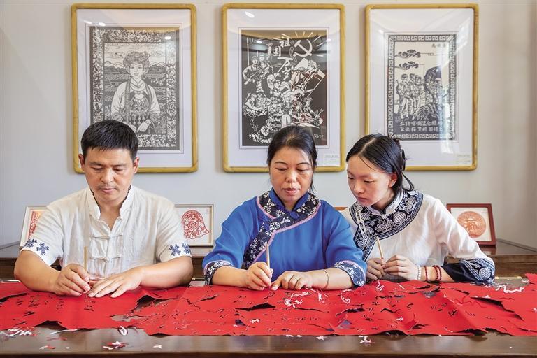 9月26日,瀘溪縣踏虎鑿花非遺傳承人等在踏虎鑿花傳習所創作“中國紅”鑿花作品,以踏虎鑿花這一獨特的民間傳統手工藝向祖國母親表達最誠摯的祝福。 張克寧 攝