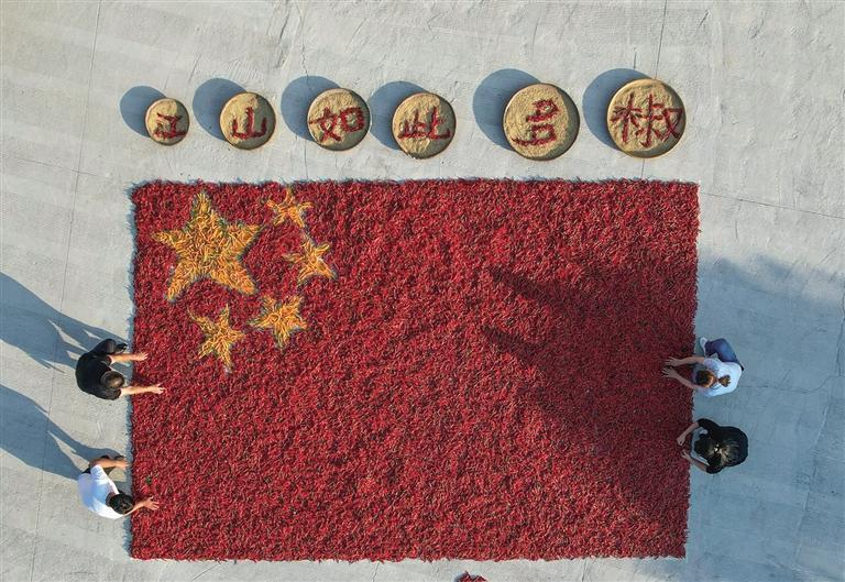 9月30日,在保靖縣清水坪鎮小溪村,村民用紅彤彤的辣椒和金燦燦的黃貢椒拼成一面五星紅旗,以和美鄉村特有的曬秋方式表達對祖國的熱愛。 俞采華 湯超英 攝