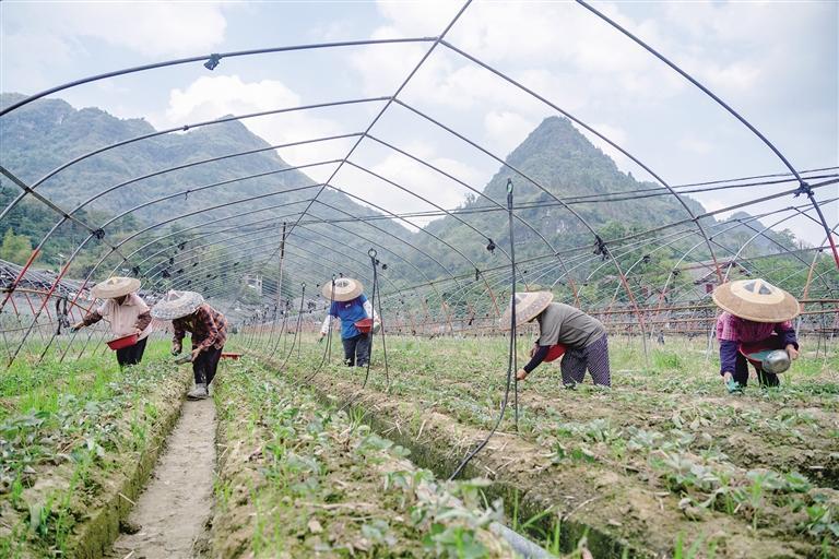 9月28日,吉首市矮寨鎮坪朗村村民正在草莓種植基地除草、施肥、澆水。近年來,該村因地制宜發展特色產業,打造集休閑觀光、采摘體驗于一體的鄉村游,促進村民增收,助力鄉村振興。