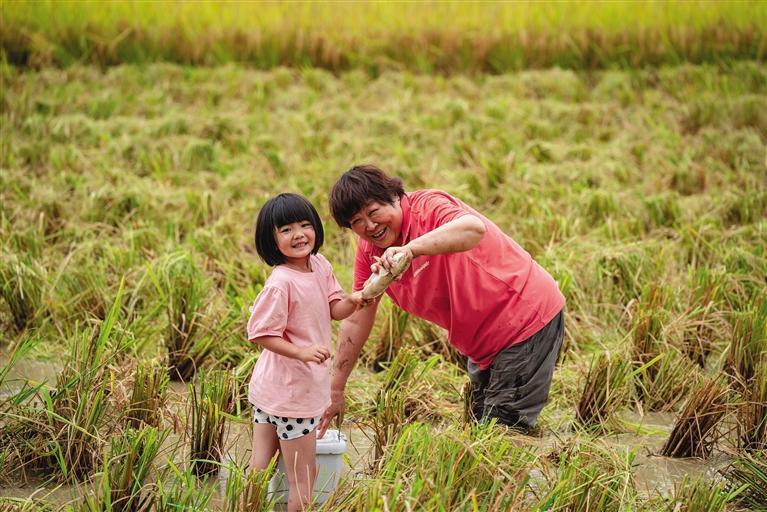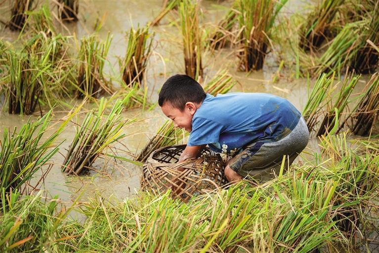 和爸爸一起捉稻花魚最開心。