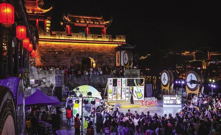 10月25日,吉首市乾州古城燈火璀璨,吉首市融媒體中心主辦的《城市音樂日》第一季激情啟幕,吸引眾多市民游客前來觀看,寧靜的古城一時間熱鬧無比。 團結報見習記者 胡承鼎 攝