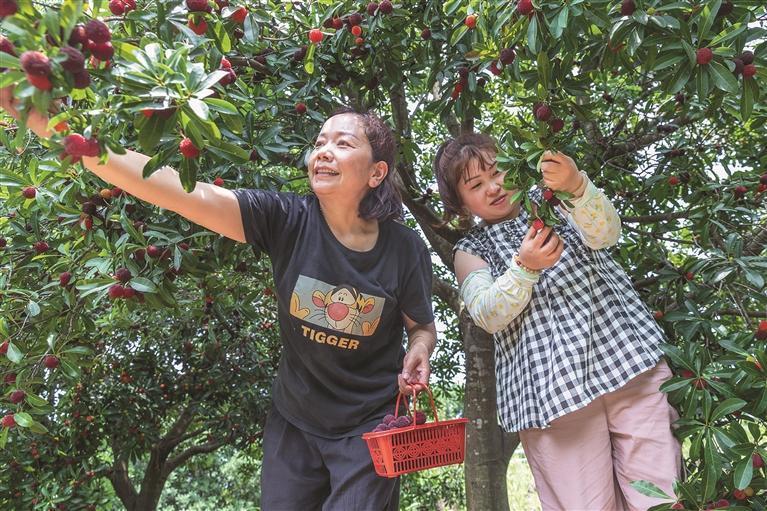 日前,瀘溪縣浦市鎮麻溪口村紅禾山莊家庭農場的員工在楊梅園采摘楊梅。紅亮圓潤的楊梅掛滿枝頭,果香四溢,周邊游客也自駕前來,體驗親手采摘的樂趣。近年來,該農場以農旅融合發展為鄉村振興注入新活力。 張克寧 楊劍波 攝