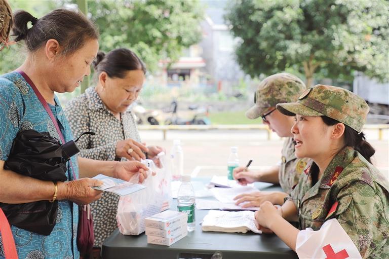 6月17日是吉首市民兵活動日,該市人武部組織醫療救護連民兵來到幫扶村己略鄉龍舞村,開展上門義診服務、野戰軍事訓練及“征兵宣傳進村寨”活動。圖為醫療救護連民兵為村民義診。 瞿芳 攝