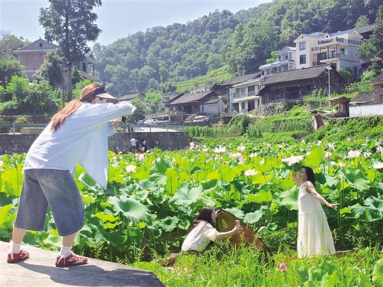 近日,瀘溪縣浦市古鎮萬荷園,朵朵荷花在驕陽下肆意舒展,將古鎮裝點成一幅清新淡雅的水墨畫卷,吸引游客前來打卡拍照。 張克寧 楊劍波 攝