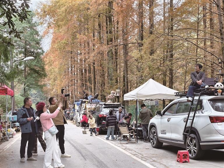 11月28日,冬日暖陽高照,鳳凰縣長潭崗景區的水杉林迎來最佳觀賞期,金黃杉樹沿公路鋪展成了一幅“秋日油畫”。周邊村民擺起文創小攤,將車頂改造成旅拍取景臺,打造 “公路 + 森林 + 車旅拍” 的輕文旅場景,吸引了不少游客前來拍照打卡,周邊村民靠服務旅拍實現靈活就業,也讓秋日山林成了鄉村增收的 “網紅打卡經濟帶”。 團結報全媒體記者 麻垣杰 闕志明 攝