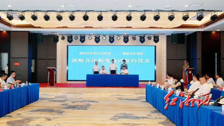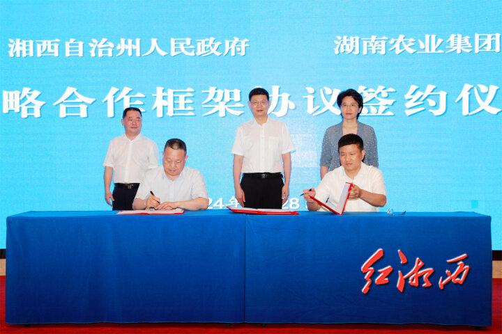 湘西網(wǎng)5月29日訊(全媒體記者 陳海泉)5月28日,湘西自治州人民政府與湖南農(nóng)業(yè)集團(tuán)戰(zhàn)略合作框架協(xié)議簽約儀式在吉首舉行。湘西州委副書記、州長陳華,湖南農(nóng)業(yè)發(fā)展投資集團(tuán)黨委書記、董事長龔小波見證簽約并講話。州委常委、常務(wù)副州長楊洪峰和湖南農(nóng)業(yè)發(fā)展投資集團(tuán)黨委副書記、副董事長、總經(jīng)理?xiàng)钫A代表雙方簽署協(xié)議。