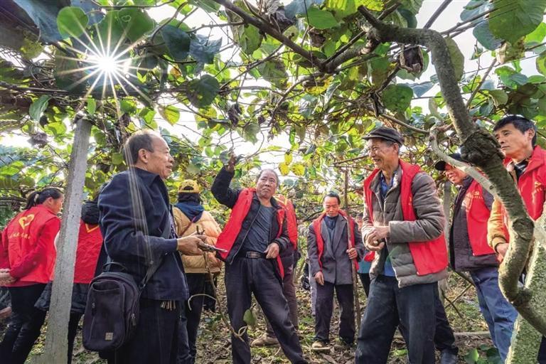 石紹生(前排左一)在獼猴桃果園為種植戶現(xiàn)場授課。