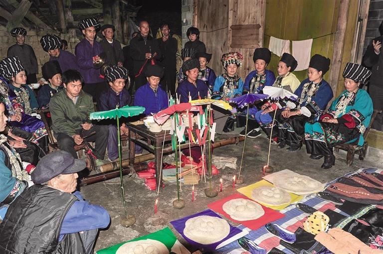 接龍開始,苗法師(苗語“巴代雄”)在戶主堂屋內鋪堂設神座。堂中央擺五大盤“龍粑”,所謂龍粑,就是用糯米粑制成龍的形狀。