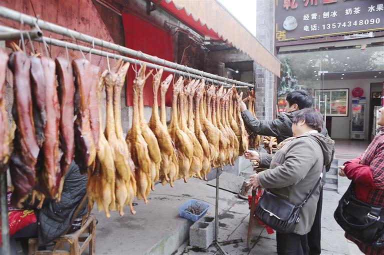 除了酸辣,乾州古城的板鴨也是吉首美食一絕。據說乾州板鴨的制作技術已有300多年,與吉首河溪鎮貢醋的歷史差不多。“鴨要肥,喂稻谷,炒鹽腌,焐得足,大料實,風得干,皮金黃,肉紅爽,骨頭酥”,這是對制作乾州板鴨原材料的特別要求,唯此才能制作出油光發亮、肉質細嫩、馥郁撲鼻、美味絕佳的正宗乾州板鴨。當然,有了這些原材料還不夠,還得配上二水繞洲、三陸橫陳、狀如乾卦、地理位置得天獨厚的乾州古城,沒有了這塊風水寶地,自然也就無處可產如此美味的乾州板鴨了。