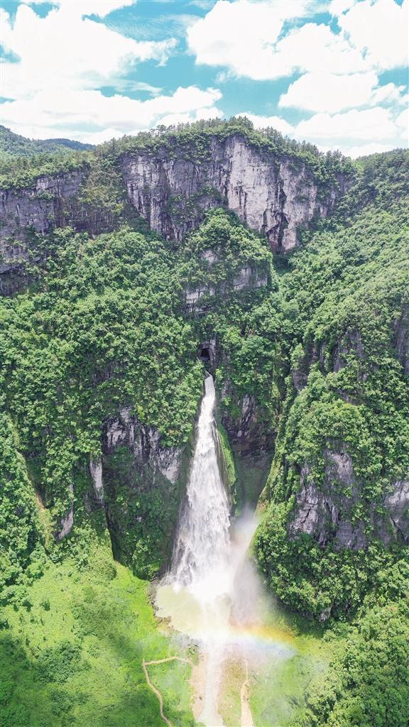 6月6日,江西省宜春市的瀑布攝影愛好者曾先生專程來大龍洞拍攝。他說,相比之前拍過的瀑布,大龍洞的落差更大、水量更多、風景更原始。他還驚喜地發現,無人機飛至半空中,鏡頭里會出現一條絢爛的彩虹。