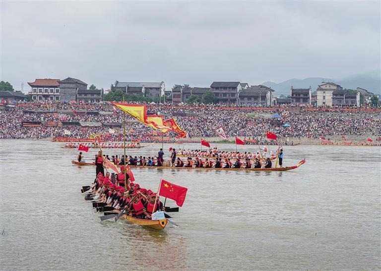 這天,浦溪村的龍舟在代朝山真武殿祭祀完,在村口辦完龍舟“跑火”儀式之后,在一片“喲嗬”聲中和鞭炮聲中下水了。岸上站滿了男女老少,龍舟在一片熱烈的歡笑里,蛟龍一般劈波斬浪地遠去。