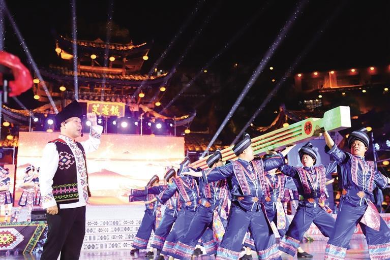 活動(dòng)主題晚會(huì)“踏歌千年”在擺手堂上演。晚會(huì)以土家吊腳樓為幕布,將現(xiàn)代聲光電與地域風(fēng)貌、民風(fēng)民俗、歷史傳奇等融合,通過器樂、武術(shù)等表演,情景歌舞和歌曲聯(lián)唱等形式呈現(xiàn)立體多維的湘西記憶,堪稱一場(chǎng)文化生態(tài)的盛宴。那些來自故土的原聲,那些神秘而獨(dú)特的祖先歌舞,那些薪火賡傳的新時(shí)代故事,讓湘西格外璀璨耀眼。
