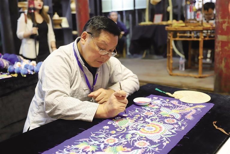 館內(nèi),游客絡(luò)繹不絕。國家級(jí)非遺項(xiàng)目湘西苗畫國家級(jí)代表性傳承人梁德頌埋頭作畫。只見他用一支小楷筆在深紫色的布料上筆走龍蛇。“我畫了50多年苗畫了,早已在心中打好草稿了。”他笑著說。畫里,龍飛鳳舞,喜鵲翻飛,色彩極盡艷麗。