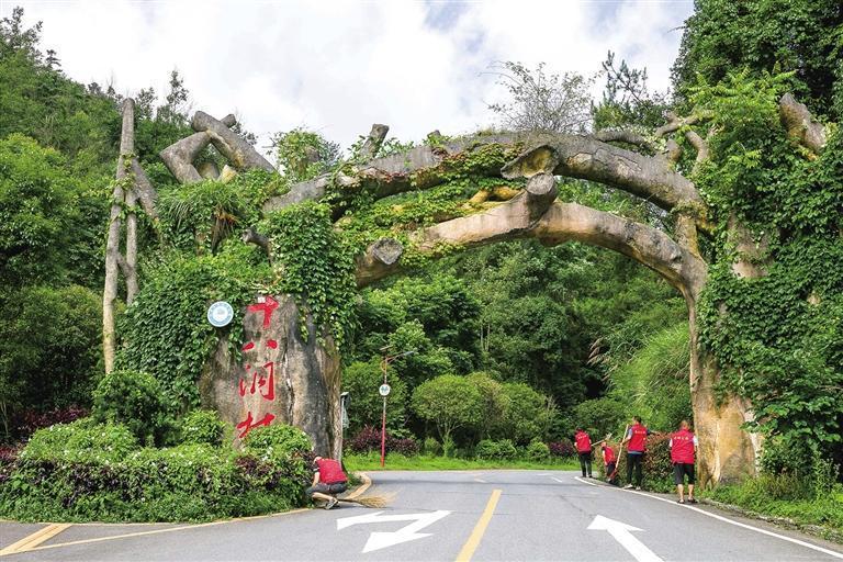 在十八洞村口,養護人員正在清理溝渠積物和路邊雜草。 團結報全媒體記者 楊賢清 攝