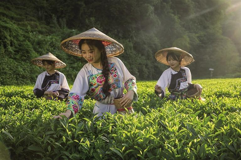 保靖縣呂洞山鎮(zhèn)黃金村至葫蘆鎮(zhèn)國(guó)茶村路段,苗家采茶女正在采茶。 舒冰 攝