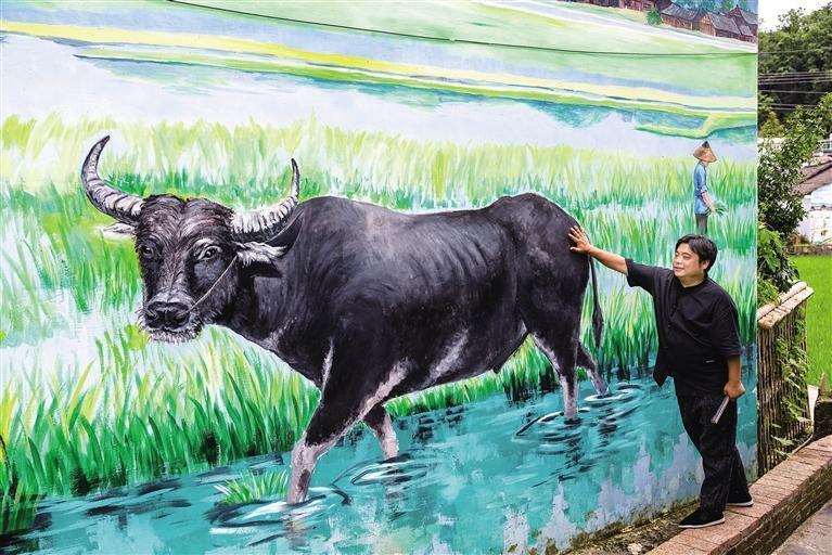 走進村寨,農耕文化氣息濃烈。游客在農耕主題墻繪前欣賞、觸摸。