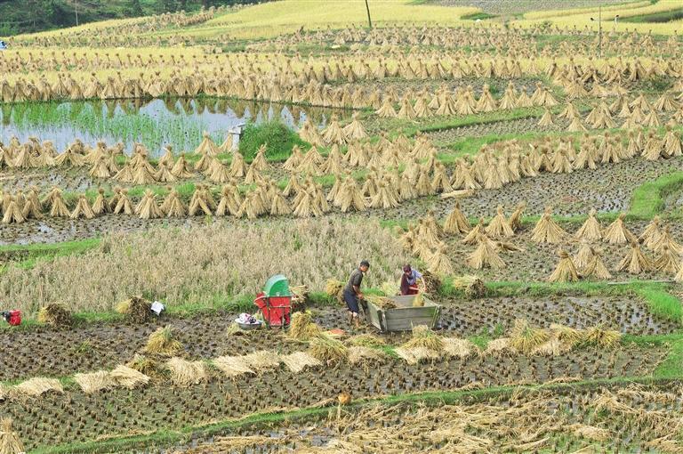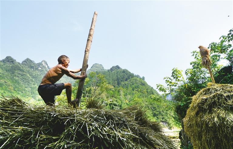 在農(nóng)村看村里的生產(chǎn)好不好,望農(nóng)家的日子行不行,最直觀的感覺(jué),就是草堆堆得多不多,草多糧多,日子就好過(guò)。在上個(gè)世紀(jì)大集體的時(shí)代,我們村堆草最多的地方叫排德耶(苗語(yǔ):大坡坪的意思)。大坡坪海拔地勢(shì)較高,有起伏綿延的數(shù)百畝梯田,這里陽(yáng)光充足,氣候溫和,是我們村里最大的糧倉(cāng),它產(chǎn)出的糧食供奉著全寨子八九十戶人家、兩三百人畜的口糧哩!雖然大多是雷公田,靠天吃飯。但遇到風(fēng)調(diào)雨順,那滿山遍野的稻田綠油油的,金燦燦的,秋后收割的時(shí)候,生產(chǎn)隊(duì)的倉(cāng)庫(kù)里還有不少的余糧。曾經(jīng)有一年,公社負(fù)責(zé)人專門在我們村組織召開(kāi)了有全公社各大隊(duì)、生產(chǎn)隊(duì)長(zhǎng)關(guān)于農(nóng)業(yè)生產(chǎn)的經(jīng)驗(yàn)交流會(huì),總結(jié)表?yè)P(yáng)了我們村農(nóng)業(yè)生產(chǎn)搞得好。但是,要是遇上天旱,那苦日子就來(lái)了。記得1972年遇到大旱,我們村里大坡坪梯田因缺水,稻草都被曬死了,田里顆粒無(wú)收。公社分配給農(nóng)戶的統(tǒng)銷糧,由于交通不便,需要到幾十公里開(kāi)外的糧站去挑。