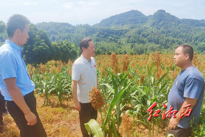 盛夏時(shí)節(jié),馬頸坳鎮(zhèn)著落村云霧糯高粱千畝示范基地一片欣欣向榮。虢正貴沿著山間小道一路察看高粱長勢。他說,要繼續(xù)完善基地基礎(chǔ)配套設(shè)施建設(shè),使基地實(shí)現(xiàn)旱能灌、澇能排。要提高機(jī)械化程度,加強(qiáng)科學(xué)管理,降低高粱種植成本。要合理布局農(nóng)作物輪種,保持土壤肥力,切實(shí)做好水土流失防治,提升高粱品質(zhì),保障酒鬼酒原料的穩(wěn)定有效供給,促進(jìn)湘西白酒產(chǎn)業(yè)高質(zhì)量發(fā)展。