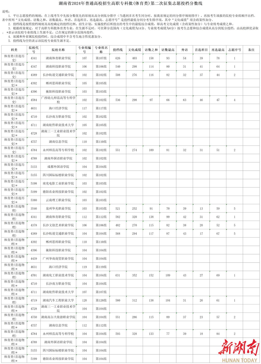 華聲在線8月23日訊(全媒體記者 余蓉)今天,湖南省教育考試院公布了湖南省2024年普通高校招生高職專科批第二次征集志愿投檔分數線,包括普通類、體育類、藝術類、職高對口類。記者注意到,少數院校專業組分數線仍在高位,但還有大量院校專業組因生源未滿而未顯示投檔分數線。