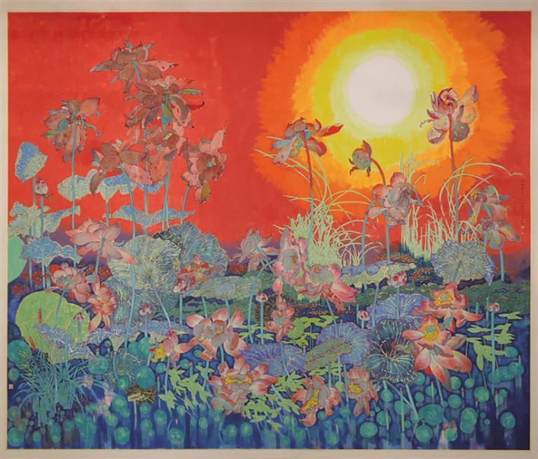 2009年9月, 黃永玉為榮寶齋大廈落成,歷時四十余天,創作了巨幅畫作《紅荷圖》,畫作色彩厚重喜慶,充滿撼人心魄的張力。先生在上世紀五十年代就與榮寶齋合作交往,在那里創作了木刻水印《阿詩瑪》等著名作品。他將這幅5米乘6米的《紅荷圖》巨作贈與榮寶齋,在當時社會及文化藝術界引起了極大的轟動。左為畫作《紅荷圖》,右為黃永玉創作《紅荷圖》時現場工作照。