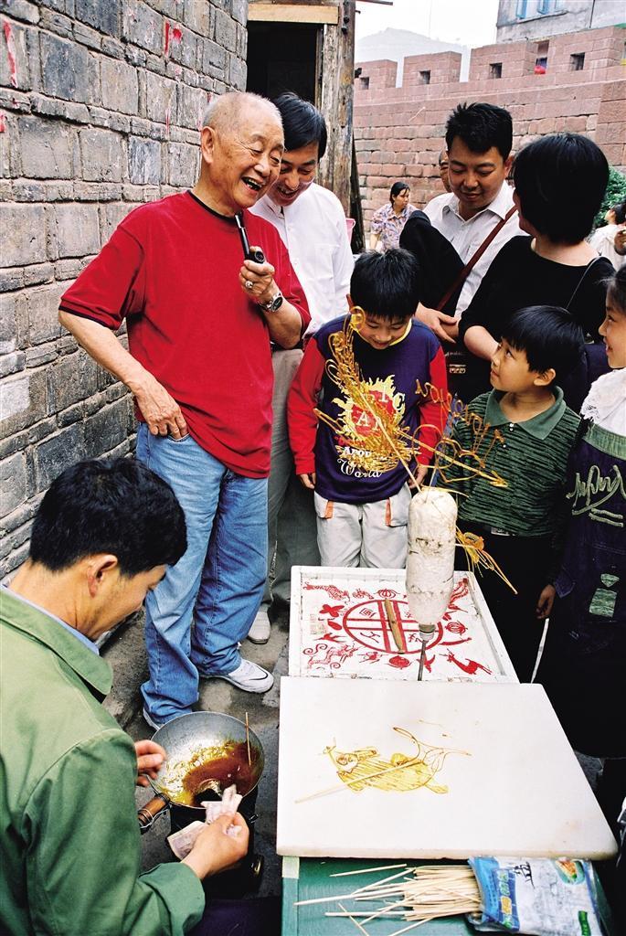 糖人的制作工藝主要包括吹糖人、畫糖人和塑糖人三種,這一手工藝遍布祖國大江南北,深受小朋友們的喜愛,也是許多成年人兒時的美好回憶。這是1997年初秋,鳳凰東城門旁的這個糖人手藝小攤兒,將先生的思緒拉回到久遠的孩童時代,讓他的笑容有了一種穿越感。
