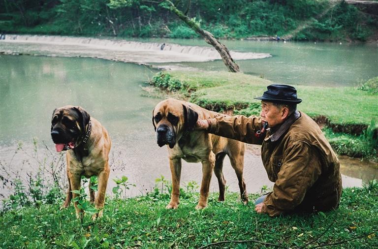 1996年,黃永玉和家人從香港回到了故鄉鳳凰,此外,他還帶回了愛犬卡米和里戈。那段時光,讓先生興致很高,以至于讓他生出“感覺自己本事用完了,回到故鄉就又有了”的慨嘆。這是停留鳳凰期間,在城郊的官莊附近春游,大家一起殺羊“打波斯”(指祈禱、還愿)時,先生與愛犬互動的情形。