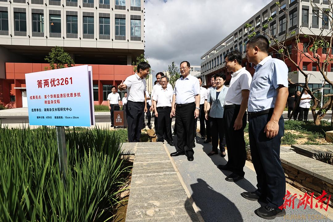 岳麓山實驗室以“建設國內頂尖、世界一流的種業實驗室”為目標,致力于種質資源保護利用、基礎理論與前沿技術研究、關鍵核心技術攻關、重大戰略性新品種培育等,是我省“4+4科創工程”的核心組成部分。實驗室主要布局集聚區、隆平片區、林大林科院片區、岳麓山大科城四大片區,構建“4個功能研究部+8個公共創新平臺+15個品種創制中心”功能平臺體系,預計今年10月將迎來首批科研團隊入駐。岳麓山實驗室集聚區占地589.85畝、總建筑面積41.76萬平方米,17棟主體建筑已進入收尾階段,未來這里將成為重大戰略種源創新區、生物遺傳基礎和育種共性技術研究創新區、高水平種業創新人才集聚區。毛偉明一行實地察看了油菜品種創制中心、水稻品種創制中心、雜交水稻全國重點實驗室和水稻試驗田等,詳細了解園區布局、實驗室配置、功能配套等。他強調,要錨定國內頂尖、世界一流,打造以種業為重點的現代農業實驗室,搭建國際化、標準化、通用化、智能化功能平臺,加快配套設施建設和人才團隊引進,讓實驗室盡快用起來、成果“長”出來。