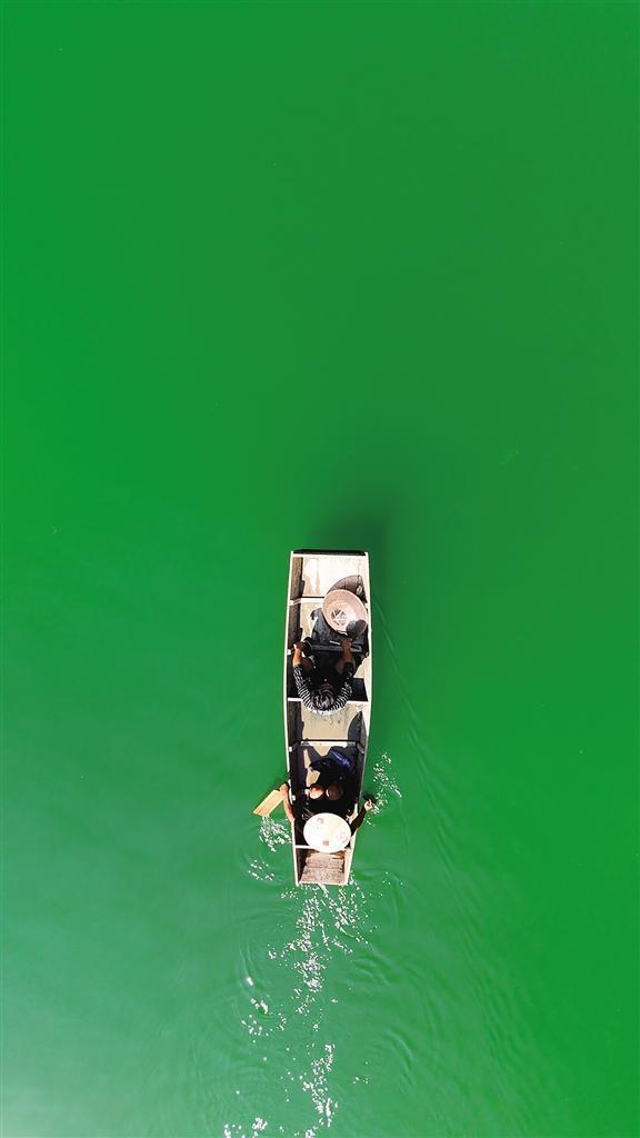 雖已入秋,正午的太陽仍然火辣。泛舟綠綠河上,時有微風拂面,令人甚感涼爽。風過時,兩岸樹上有枯葉飄落水面,浮在河上,為碧綠的水面平添一分靜謐。