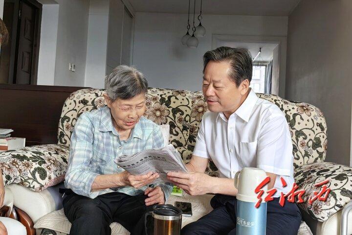 “陶老,您好,我們來看望您了!”來到離休老黨員、老干部陶孝忠家中,虢正貴握住老人的手,關(guān)切地詢問她日常生活起居和身體情況。得知老人目前身體不錯,每天還堅持學(xué)習(xí)、讀報時,虢正貴和陶老一起翻閱剛到的《團(tuán)結(jié)報》,聊起湘西州發(fā)展和日新月異的變化,對她和曾經(jīng)的老一輩用青春和熱血為如今的盛世華章奠定堅實基礎(chǔ)表示敬意,希望她保重好身體,安享幸福晚年,并一如既往地關(guān)心、支持湘西的發(fā)展。“咱們現(xiàn)在一起見證中華人民共和國成立75周年,2027年再共同慶祝建軍100周年!”