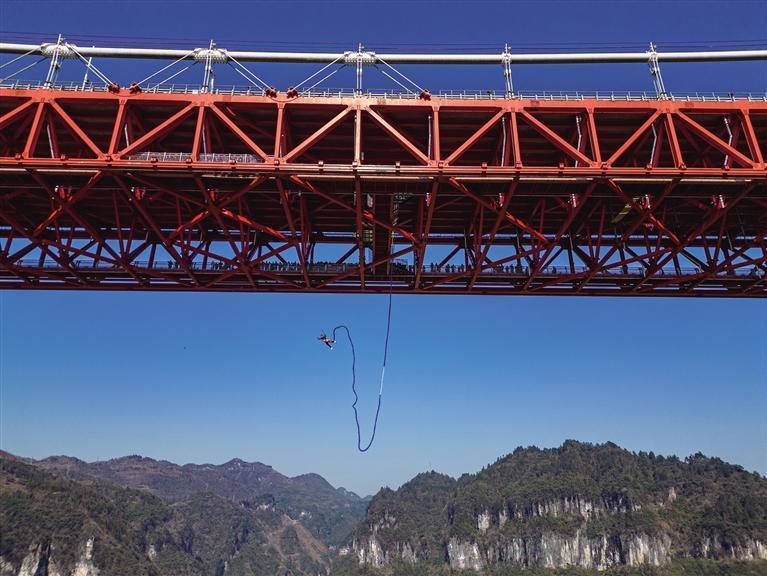 游客體驗矮寨大橋高空蹦極項目,叫喊聲響徹山谷。