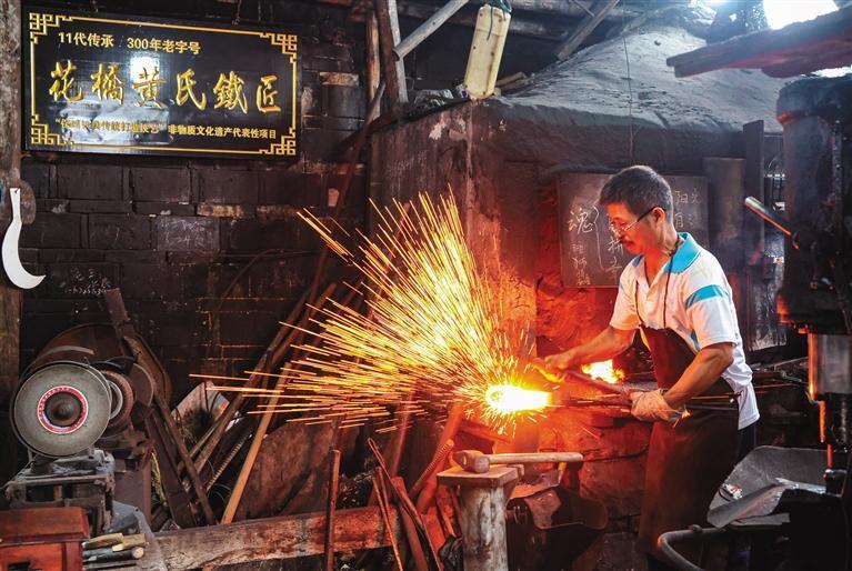 花橋黃氏鐵匠鋪是湘西保存最完好的鐵匠鋪之一,純手工打造的生活器具備受消費者青睞。團結報見習記者 胡承鼎 攝