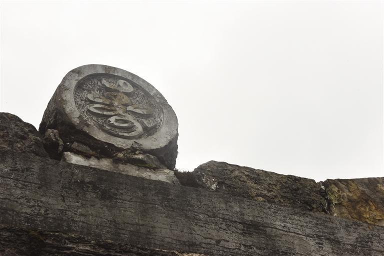能有如此管理水準(zhǔn),可見,大白巖的先祖?zhèn)兘^非鄉(xiāng)野村夫、等閑之輩。這一點(diǎn),還可以從村里數(shù)個(gè)滄桑的石門上得到印證。村民們把這些石門稱為“石龍門”。石龍門由青石壘砌而成,門楣上方青石被鑿成昂首的龍頭,門框兩側(cè)刻有對(duì)聯(lián)。對(duì)聯(lián)經(jīng)風(fēng)雨沖刷、歲月滄桑,絕大多數(shù)字跡模糊、漫漶不清,甚至完全消融了,但立于村口的那座,認(rèn)真讀來(lái),仍可辨析,上聯(lián)為:負(fù)來(lái)營(yíng)生田野門時(shí)多樂事,下聯(lián)為:橫經(jīng)為業(yè)山林內(nèi)夜有書聲。相傳這里是“功福卡”所在地,家族大小事宜都由這個(gè)部門進(jìn)行綜合管理。