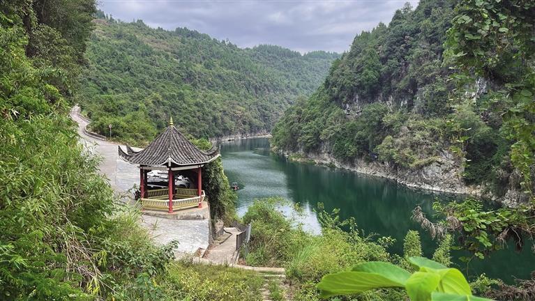 我站在列夕老碼頭上,看到猛洞河的水靜靜地匯在山谷之間。那水是靜態的,看不出一點流動的跡象。只有偶爾吹來的一陣風,在河面掀起一點漣漪。抬頭望去,是一條長長的河谷,河岸高達100多米,懸崖峭壁上,長滿各種樹和藤蔓,很多是倒垂著的,顯得特別茂盛。再看藍天,只有河谷上面的一線,有白云飄忽,有鳥兒飛翔。
