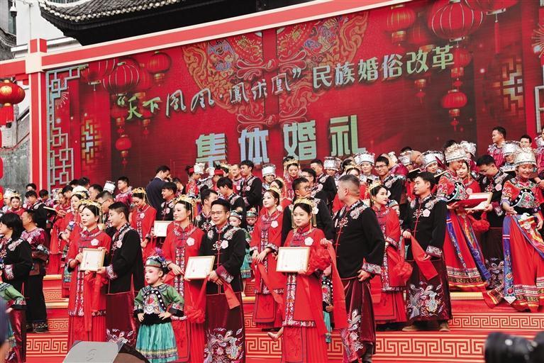 湘西網11月12日訊(全媒體記者 肖穎 特約全媒體記者 黃文淵)11月11日,“天下鳳凰·鳳求凰”民族婚俗改革集體婚禮在鳳凰古城舉行。來自全國各地的百對新人身著華麗的民族婚服,共同參加集體婚禮。