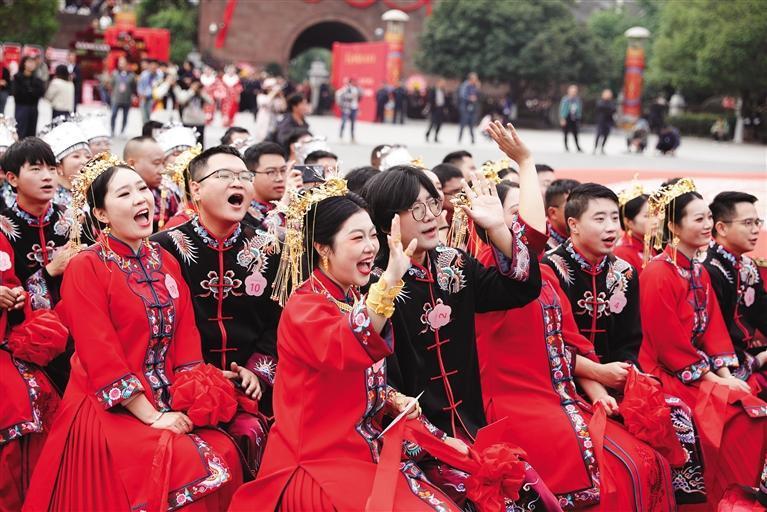 現場張燈結彩,隆重熱烈。在歡快的苗鼓聲中,新人們按照婚禮流程完成頒發婚書、宣誓、拜堂等流程,巡游隊伍浩浩蕩蕩地在古城中穿行,一路上鑼鼓喧天、喜氣洋洋。古城的游客們也跟著巡游隊伍,送上對新人的祝福。新人們手牽手,向過往游客和商家分發著象征幸福甜蜜的喜糖。在沱江之上,彩船載著滿懷幸福喜悅的新人們歡快地駛向萬壽宮,新人們走過虹橋,在南華山下,接受神鳳祝婚,在古城的見證下,彼此許下愛的誓言。