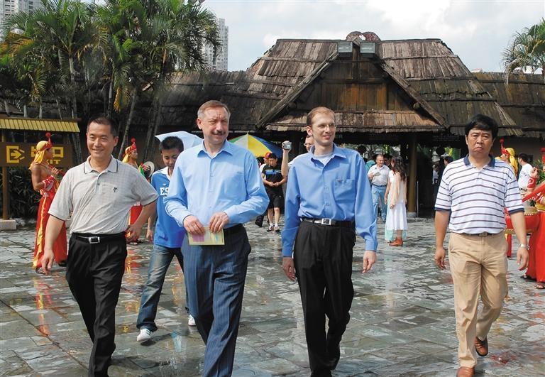 吳建偉(右一)陪同俄羅斯游客游覽錦繡中華民俗村