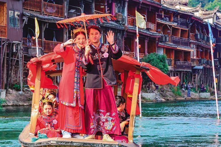 為了延續集體婚禮的熱度,鳳凰古城新發布了文旅新產品“鳳凰古城·傳統婚俗沉浸式集體婚禮”,游客可以報名體驗傳統的接親出嫁環節、熱鬧的迎親巡游和豐富的文化活動以及苗家長龍喜宴等。這就打下了“旅游+婚禮”的2.0版本。