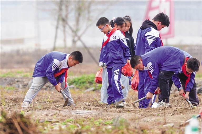 在農耕體驗園區,孩子們拿著小鋤頭在一片紅薯地里勞作,挖到紅薯猶如挖到了“寶藏”,盡情享受著豐收的喜悅。