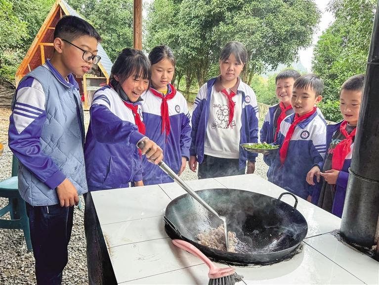 “洗完鍋后,要等鍋中的水干了才能倒油。”“青椒炒肉,要先炒肉,后下青椒。”“柴火不能燒太旺,要不然會把菜炒煳。”……在開心廚房活動區,孩子們分為若干小組,分工有序,圍著灶臺大展身手。煙火氤氳中,一道道香氣撲鼻的菜肴紛紛出鍋。