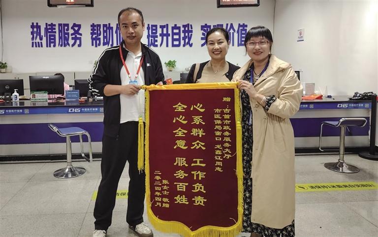 2024年4月,吉首市參保對象張女士將一面印有“心系群眾 工作負責 全心全意 服務百姓”的錦旗送至吉首市醫保服務大廳工作人員手上。