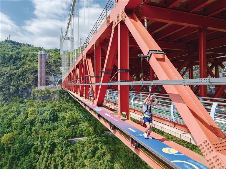 9月22日,2024湘西矮寨大橋“高空鐵三”挑戰賽在吉首市矮寨奇觀旅游區炫酷開賽。此次“高空鐵三”競賽包含了矮寨奇觀景區所獨有的云中漫步、高橋矩陣和飛拉達等三個項目,吸引了全國各地的300名選手參加,在峽谷絕壁間和矮寨大橋上盡情享受跑步的樂趣和極限運動帶來的刺激。 彭璟 攝