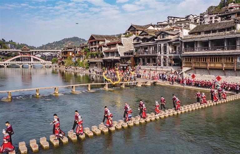 11月11日,鳳凰古城舉行集體婚禮,100對新人身著傳統服飾,攜手走進婚姻的殿堂,喜結百年之好。這場隆重熱烈的中式集體婚禮展現了民族婚俗的魅力,帶動鳳凰縣文旅高質量發展不斷邁上新臺階。 胡承鼎 攝