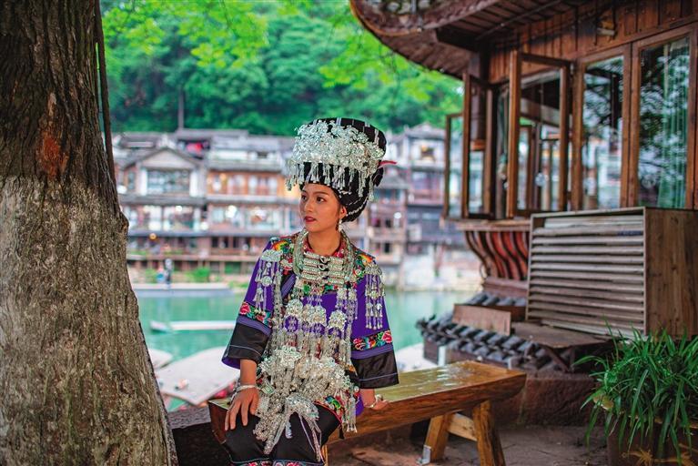 佩戴著熠熠生輝的銀飾,身著嶄新苗服的龍美元,成為沱江邊上一道亮麗的風(fēng)景。 團結(jié)報全媒體記者 胡承鼎 攝