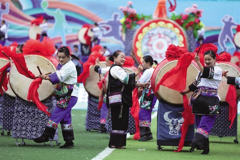 湘西苗族鼓舞,不只是鼓舞,還凝聚了苗族服裝、苗族生活藝術等苗族人民的卓越智慧。洪富強的弟子龍梅翠說:“更多的是苗族文化的融入,比如將苗家打巖打鐵、劃龍船拉纖、捉魚撈蝦等生活元素藝術地融入苗鼓。”