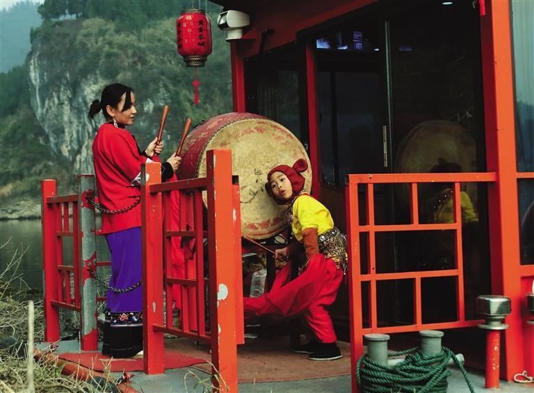 5歲的猴兒鼓傳承人張昊瑾,觀察野生獼猴的形態動作之后,即興練起了猴兒鼓。 團結報全媒體記者 朱開朗 通訊員 王勇 攝