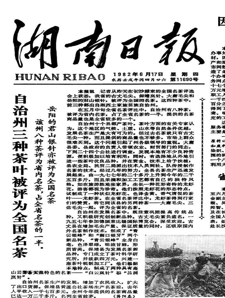 1982年《湖南日報》頭版頭條報道“保靖嵐針”為全國名茶。